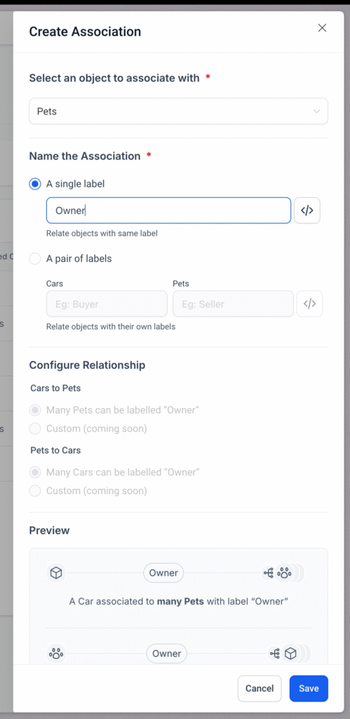 - Example: For associating a car with its owner, you might set the labels as “Owner” and “Car.”
