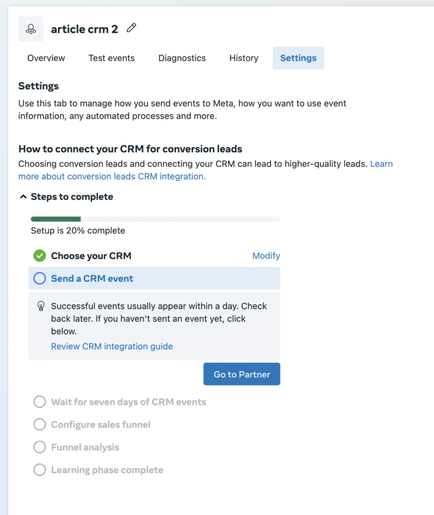 9. Return to the “settings” tab in Events Manager to track the progress of the Conversion Leads integration.