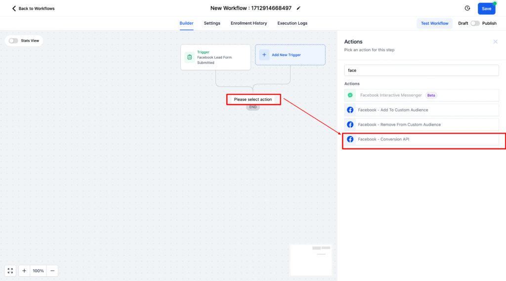 2. Add a new Workflow Trigger in your Workflow and have it get fired off by Facebook Lead Form Submitted (if that is the first stage of your conversions flow)