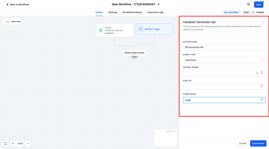 1. Create another workflow. Add the Pipeline Stage Change trigger and a Facebook Conversion API action.