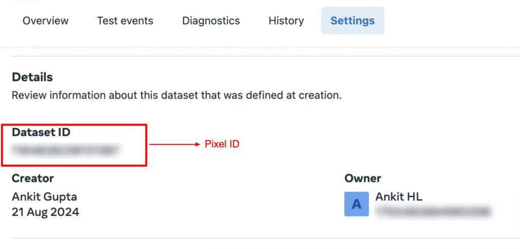 7. For the Pixel ID, head over to your Facebook Events Manager> Data Sources> Settings> Scroll down and copy your Dataset ID (this will be Pixel ID). Paste the Pixel ID in the Pixel ID field in your Workflow’s FB Conversion API Action.