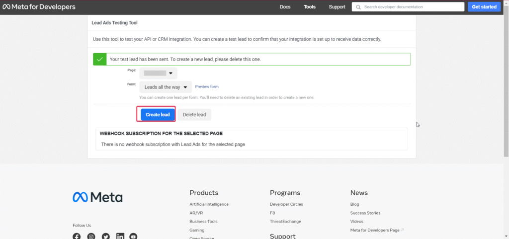 6. You can test your Workflow using the Lead Ads Test Tool. Choose the correct Page and Lead Ad Form, then Create a Lead.