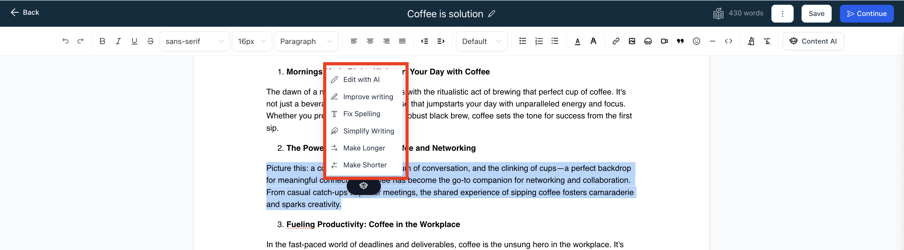 3. When starting a blog post text, there will be option of AI visible with its options.