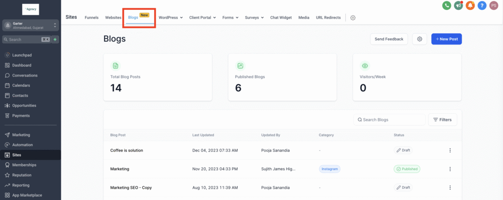 - Go to Sites > Blogs