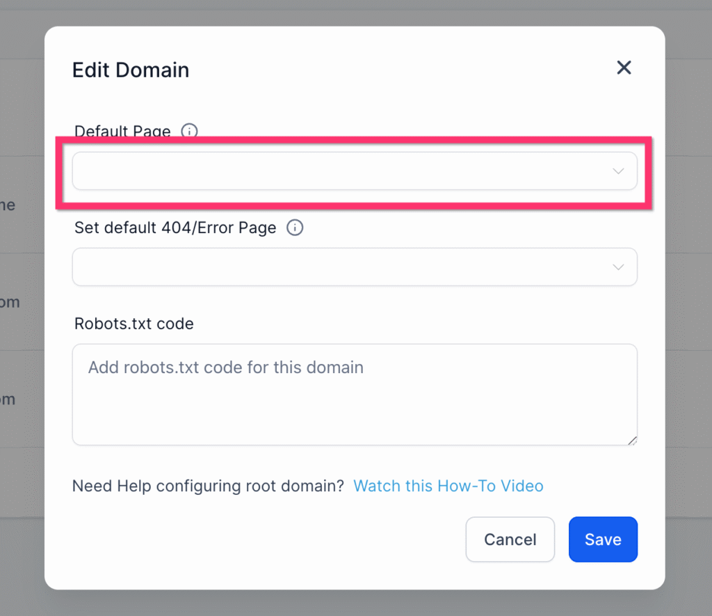 Note: If you want a funnel step / website page to open without a path (domain.com instead of domain.com/home), you can select that page as the default page for that domain. A default page can be selected from Settings > Domains > Edit Domain.