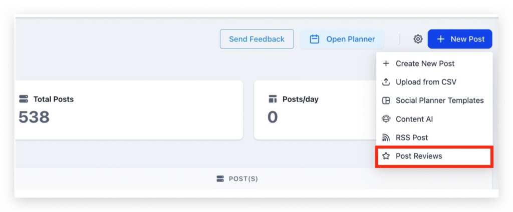 - Create a review automation by navigating to ‘Social planner’ -> ‘New post’ CTA -> ‘Post Reviews’.