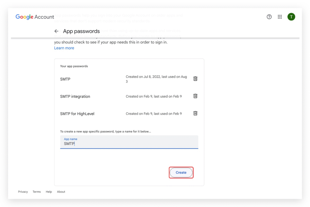 9. Type an App Name, e.g. SMTP integration > Click on Create