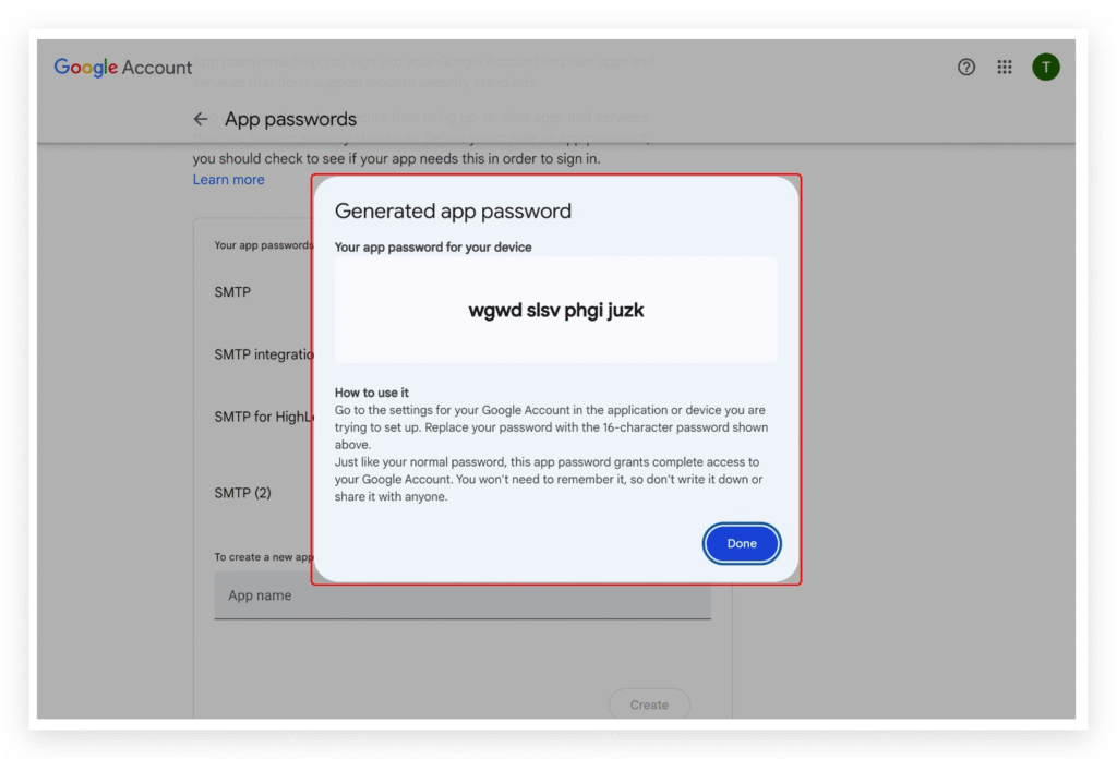 10. Drag to copy the app password and paste it as the password when integrating Gmail SMTP
