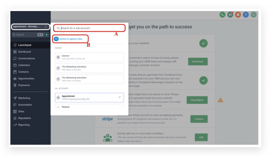 12. A. Search for a sub-account if you want to integrate Gmail SMTP for a location